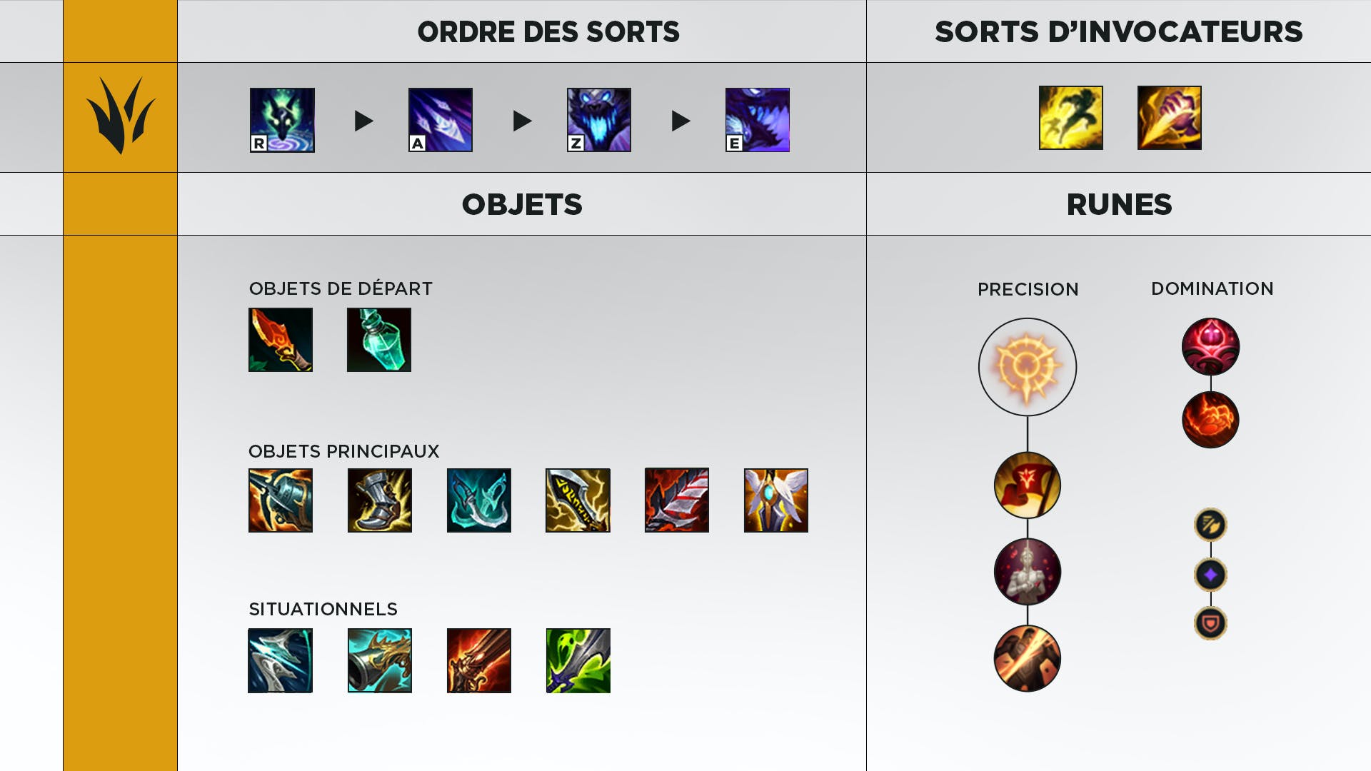 Bonne nouvelle, avec Manaty il n’y a pas trop de prise de tête avec les runes et il joue Kindred avec toujours la même page de runes ! Il sélectionne la Keystone Attaque soutenue pour ses énormes dégâts qui se combinent très bien avec le Tueur de Krakens. Il s’oriente ensuite sur Triomphe (bonus de soin et bonus de gold), Légende : sangsue (bonus de vol de vie) et Abattage (bonus de dégâts sur les ennemis qui ont plus de vie que vous). Étant donné qu’aucun de vos objets ne vous donnera des PV, cette rune est toujours rentable.
